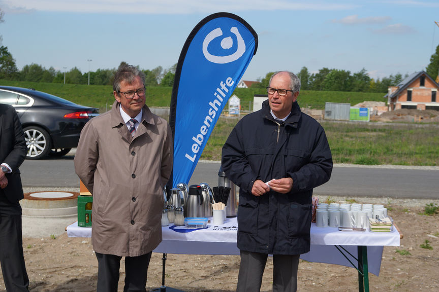 Der Bürgermeister Michael Dreier sowie der Landrat Manfred Müller verstehen das Neubauprojekt als Bereicherung für die Stadt Paderborn und hoben im Kontext des neu entstehenden Quartiers die hohe Bedeutung der Inklusion hervor. In ihren persönlichen Grußworten wünschten sie dem ehrenamtlich tätigen Vorstand und der Geschäftsführung der Lebenshilfe alles Gute für die Bauzeit und stets gutes Gelingen. Da ihnen das Projekt und der Fortschritt des Baus am Herzen liegen, regte der Bürgermeister in seiner Ansprache ein gemeinsames Fest nach der Fertigstellung des Rohbaus an. Herr Müller und Herr Dreier sicherten spontan ihre Teilnahme zu.